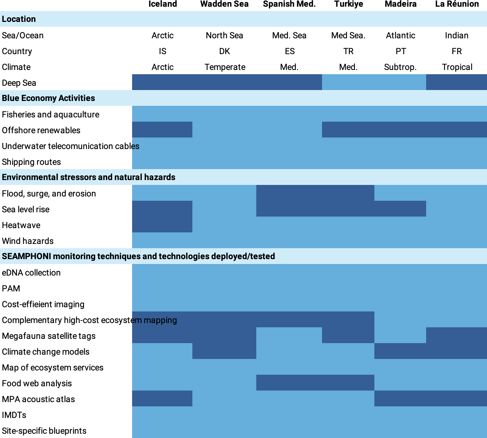 Summary of SEAMPHONI demonstration sites. Coloured tags indicate that the characteristic is relevant (light blue) or not relevant (dark blue) to that site.